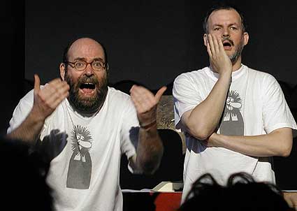 | Wir sind zwei evangelische Pfarrer und machen zusammen Kabarett. Das freut die Leute. Und uns erst......! Scheinbar ist die Kombination "Pfarrer" und "Kabarett" etwa genau so interessant wie die Meldung: "Oma beißt Hund." Immer wieder kommen Neugierige in unsere Veranstaltungen und haben so ein ungläubig-zweifelndes Leuchten im Gesicht: "Mal sehen, ob die wirklich lustig sein können!" oder: "Am Ende sind es nur Lehrer, die sich als Pfarrer ausgeben?". Bei Zweifelnden erwacht in uns hormongesteuert der Bonifatius-Reflex und wir geben alles - und siehe da: Es funktioniert, die Leute lachen, klopfen sich auf die Schenkel und sagen: "Also, das hätte ich wirklich nicht gedacht, daß die so witzig sind." Wir halten uns an das, was die Heilige Elisabeth einmal gesagt hat: "Wir sind gekommen, um die Menschen froh zu machen." Über 650 mal standen wir inzwischen auf kleinen und großen Bühnen, in schnuckeligen Gemeindehäusern, ehrwürdigen Kirchen und auf richtig tollen Kabarett-Bühnen. Wenn wir richtig mitgezählt haben (in der Kirche macht das immer die Küsterin), haben uns dabei mittlerweile fast 150.000 Menschen zugeschaut. Unglaublich! Manche kommen sogar öfter. Freiwillig! Na, uns soll´s recht sein. Wir sind: Hans-Joachim Greifenstein, Jahrgang 1957, Pfarrer, Kabarettist, Kommunikationswirt und dogmatischer Südhesse wurde in Hofheim/Taunus geboren. Er verbrachte viele Jahre im Widerstand gegen alles Mögliche, was dann am Ende doch gebaut, stationiert oder gewählt wurde ("wer gewinnen will, braucht nur mich als Gegner "). Er studierte Evangelische Theologie, Hochschulpolitik und Liebe in Frankfurt und Marburg. Sein auratischer Ort ist das Pellice-Tal in Norditalien, wo ein, zwei Dreitausender schon von ihm betreten worden sind. Seit 1986 ist er Gemeindepfarrer in Babenhausen, aber das ist eine ganz andere Geschichte.................
