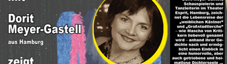 Dorit Meyer-Gastell, Schauspielerin und Tanzleiterin im Theater Esprit Hamburg: ein weiteres Solo erzählt von der Lebensreise der jüdischen Dichterin Mascha Kaléko Das Theaterstück kann mit den Attributen: lebendig, sinnlich und melancholisch beschrieben werden. Mascha Kaléko - der Name der 1907 in Westgalizien/Polen geborenen jüdischen Dichterin taucht erstmals um 1930 in Berlin auf. Mit "Alltagsgedichten" erobert sie schnell die Herzen der Menschen. Die Spannung ihrer Gedichte liegt in der Vereinigung von Lyrik und Spott, von Gefühl und Ironie. In ihnen begegnen sich der vorschnelle Berliner Witz und die Trauer der jüdischen Weisheit. 1938 standen Maschas Gedichte auf der "Liste des schädlichen und unerwünschten Schrifttums". Sie floh mit ihrem zweiten Mann und dem gemeinsamen Kind nach Amerika. Doch noch härter als die Emigration in die USA wirkte 1966 die "Heimkehr ins Land der Väter" nach Israel und setzte die Dichterin der gnadenlosen Isolierung aus. Als dann ihr erwachsener Sohn und später auch ihr Mann sterben, reist sie noch einmal nach Europa. Auf dem Rückweg erkrankt sie und stirbt 1975 in Zürich. Dorit Meyer-Gastell zeichnet die Lebensreise der "weiblichen Kästner" und "Großstadtlerche" - wie Mascha von Kritikern liebevoll genannt wird - anhand ihrer Gedichte nach und ermöglicht einen Einblick in eine humorvolle, aber auch getriebene und heimatlose Dichterseele