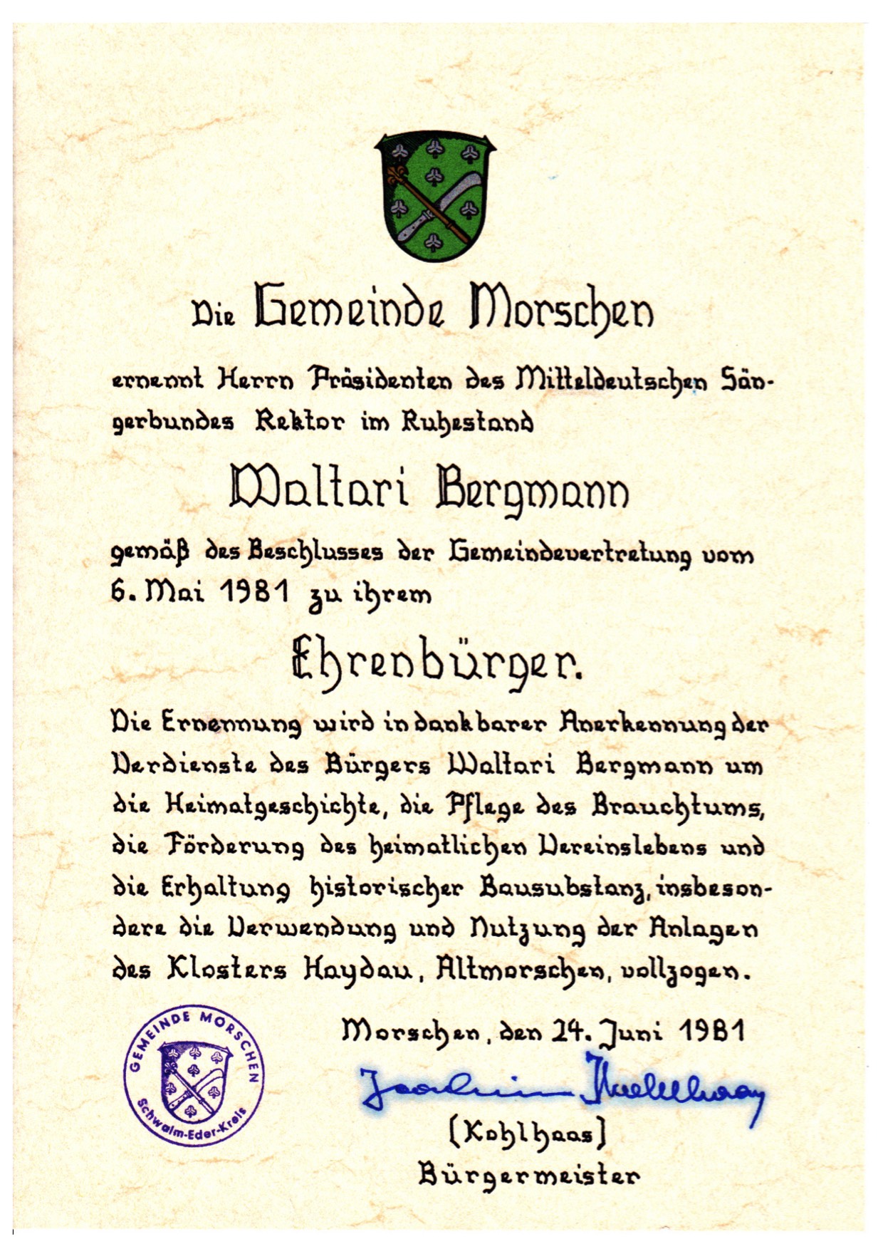 Hier wird er 1961 Hauptschullehrer und in stürmisch werdenden Zeiten Rektor der entstehenden Georg-August-Zinn Mittelpunktschule. Jakob Frankfurth und Waltari Bergmann sind die Garanten für die Einrichtung und den Ausbau der Mittelpunktschule. Waltari Bergmann beendet seine Tätigkeit als Pädagoge 1981 durch Versetzung in den Ruhestand. Rechtzeitig genug, um sein siebzehntes Buch zu schreiben: "Tausendjähriges Morschen". Tausende von Sängerinnen und Sängern kennen das markante Erscheinungsbild Waltari Bergmanns aus seinen über 2000 Auftritten bei örtlichen Veranstaltungen. 32 Jahre lang, von 1962 bis 1994 ist er Vorsitzender des Sängerkreises Heiligenberg. Im April 1994 geht er nach 24 Jahren als Präsident des Mitteldeutschen Sängerbundes beim Bundessängertag in Homberg von der Bühne und wird Ehrenpräsident. Seine freundlichen und dennoch deutlichen Erinnerungen, die Sänger in der öffentlichen Zuwendung ebenso zu behandeln wie die Sportler, oder seine stetigen Mahnungen "Rettet Kloster Haydau" blieben bei den Politikern nicht ohne Wirkung. Nie wurde er bei aller Beharrlichkeit verletzend. Dass er "nebenbei" noch fast ein Vierteljahrhundert Kreisnaturschutzbeauftragter und Vorsitzender der Lehrergewerkschaft war, bezeugt den Respekt vor seiner Persönlichkeit. Vielfach wird Waltari Bergmann aufgrund seines außergewöhnlichen Engagements für die Allgemeinheit geehrt. |