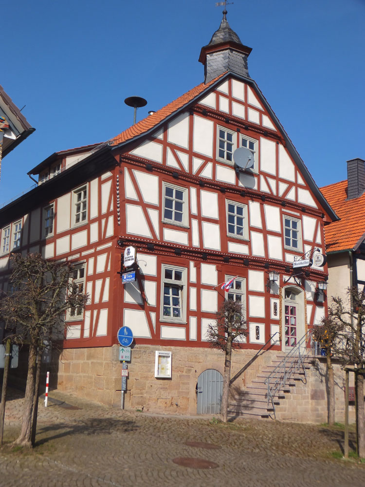 Das Weinhaus (Ratskeller) zu Neumorschen Am Markt zu Neumorschen, über den einst die ,ÒLange-HessenÒ-Straße Frankfurt - Wichte - Morschen - Leipzig führte, stehen stattliche Fachwerkhäuser aus dem 17. und 18. Jh. ãin schöner Reihung, meist mit Giebel zur Straße und mit verzierten GesimsenÒ (Dehio). Weit und breit seit 100 Jahren als Gasthaus bekannt ist das Gasthaus Horn, dessen Besitzer Josef Priller leider vor einigen Jahren starb. Hier wurde am 17. Mai 1908 der Heimat- und Verkehrsverein gegründet. Wir bewundern die Fachwerkbauten, am meisten zweifellos den heutigen Ratskeller, das einstige Weinhaus der Gemeinde Neumorschen, die als Dorf manche städtische Privilegien, Marktrecht, Dorfmauer, Braurecht, Rathaus (= Weinhaus) u. a. hatte. Das Weinhaus war aus Privatbesitz von der Gemeinde zurückgekauft und restauriert worden. Vor Jahren kam die Gemeindebücherei hier in den Sitzungssaal des Ratskellers zurück. Das Gebäude steht auf einem hohen Fachwerksockel, der die geräumigen Gewölbe birgt. Eine Freitreppe führt zur Haustür im Hauptgeschoß. Kräftig erhebt sich darüber das Fachwerk des Obergeschosses, und den zweistöckigen Giebel krönt ein 6eckiger Dachreiter, dessen geschweifte Haube ein Wetterfähnchen schmückt. Das Gebäude stammt in heutiger Form aus dem 17. Jahrhundert, doch besteht kein Zweifel, dass seine Grundmauern einen weit älteren Vorgänger mindestens seit dem 14. Jh. trugen. Neumorschen war der Mittelpunkt des landgräflichen Weinbaues an der Fulda, der erst durch den 3Ojährigen Krieg beendet wurde. Auch unser Weinhaus war Eigentum des Fürsten. Die Gemeinde hatte lange das Privileg, steuerfrei eine Wein- und Branntweinschenke zu halten. Stets war dieses Wein- oder Gemeindehaus genannte Gebäude ein (seltenes!) dörfliches Rathaus und als solches der Sitz der Gerichtsschultheißen Òuff der FuldaÒ, zu dessen Bezirk alle 7 Ortsteile des heutigen Morschen, außerdem Heinebach und Beiseförth zählten. Jeweils auf 3 Jahre wurde das Weinhaus verpachtet, d. h. der Ausschank. Von den Einnahmen mußte später die Fuldabrücke unterhalten werden - was nie ausreichte! War wieder einma! an der Brücke Hochwasserschaden, dann registrierte man, ãdaß man mehr Schaden als Nutzen vom Weinhaus habeÒ. Hin und wieder begegnen wir auch der Bezeichnung ãRathausÒ. 1716 war folgender Zins vom Weinhaus zu entrichten: 8 Albus Geld, 4 Metzen Hafer, 1 Gans, 2 Hähne, 1 Huhn und für den Schank je Fuder Wein (= 960 l) 4 Gulden (fl.) Zins für Rheinwein und 2 fl. für heimischen Landwein. Derselbe Zins wurde auch je Ohm Branntwein entrichtet. 1 Ohm betrug 160 Liter, 6 Ohm also ein Fuder. Die meisten Gerichtssitzungen und Bürgerversammlungen fanden hier statt. Den Raum mit den Fässern durften die beiden Weinzapfer nur gemeinsam betreten. 1466 wurde die Weinschenke bereits besucht, u. a. auch 1540, 1560 und 1579 wird das ãGemeinde-WeinhausÒ erwähnt. 1597 wurde die Gemeinde mit 20 Tal. Strafe belegt, weil kein Wein ausgeschenkt worden war: sicherlich eine hohe Buße für wohl verwässerten Wein! Hin und wieder lesen wir auch von Schlägereien in der Schenke. Von 1589 ist ein Bericht des Spangenberger Rentmeisters Murhard datiert, dem wir entnehmen, daß hier 90 hl Wein geerntet wurden und die 85 ãWinzerÒ ihren Landwein selbst behalten und nicht ausschenken wollten. 1614 wurde ein Prozeß geführt, weil die Herren Gemeindevertreter nach einer Sitzung noch eine weitere anschlossen - und dabei die Gemeindeurkunden gestohlen werden konnten; sie waren nicht verschlossen worden - vor 370 Jahren! Wir begegnen einer langen Reihe von ãWeinsiedenernÒ (Pächtern), darunter vielen Gerichtsschultheißen und Greben (Bürgermeister), unter ihnen Eubel, Ellenberger und Schmelz. 1891 kaufte Conrad Jungermann für 10270 Mark das Weinhaus, von ihm 1919 Georg Kersten. Als dieser 1956 starb, erreichte Bürgermeister Richard Horchler den Rückkauf durch die Gemeinde. Nach seiner Renovierung wurde das ãRathausÒ am 29.11.1958 eingeweiht und war ein Mittelpunkt der 700-Jahrfeier 1959. Der Ratskeller hatte seitdem viele Pächter. Dezember 1984 wurde als Gemeindesaal der ãReesestallÒ um- und ausgebaut (an dem Ratskeller). | |